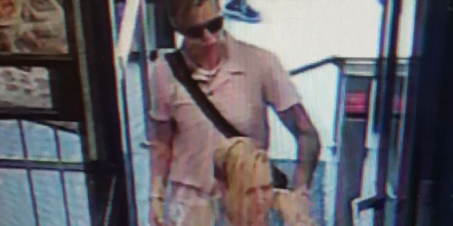 Caucasian, approximately 5’6”, heavy build, approximately 40 years of age, short blond hair on top, with shaved brown sides, wearing a blue tank top, light brown shorts, numerous tattoos on left arm, butterfly tattoo on inside left elbow.