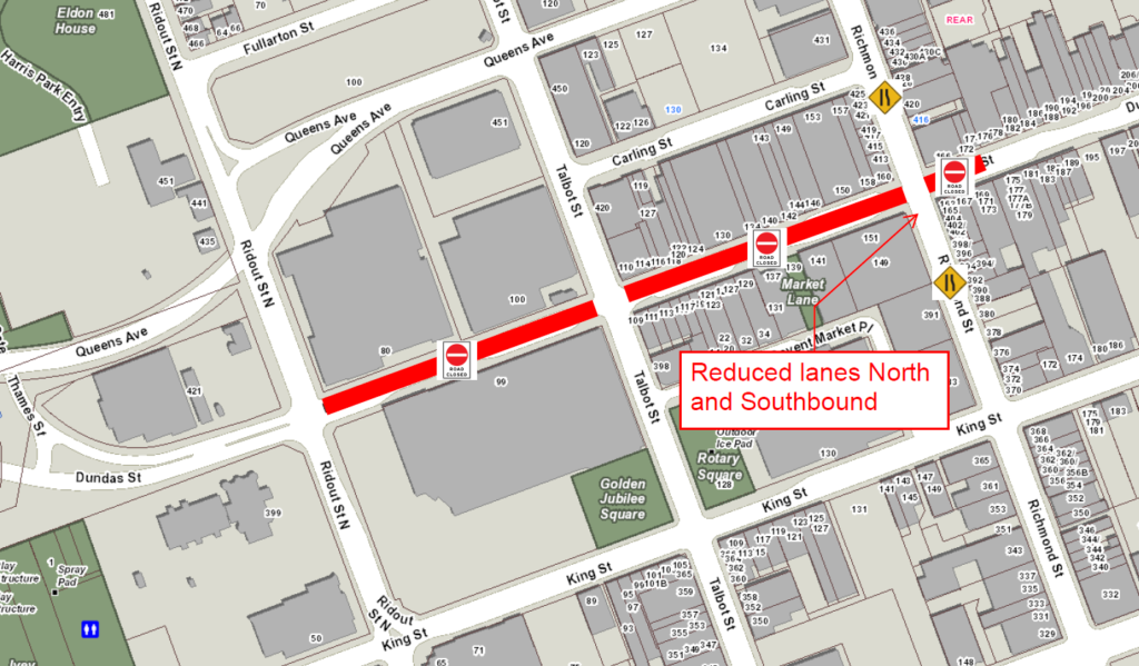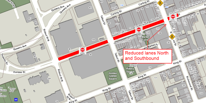 Richmond Street remains open to northbound and southbound traffic, with lane reductions continuing until further notice between Carling Street and King Street.